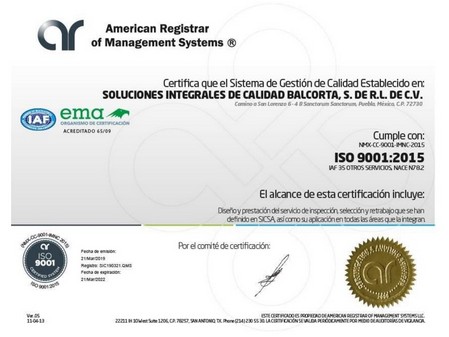 En marzo de 2019 obtuvimos el certificado ISO 9001:2015, el cual avala que nuestros procedimientos cumplen con los estándares requeridos en inspección, selección, retrabajo, empaque, ensamble de partes producción y gestión de personal.